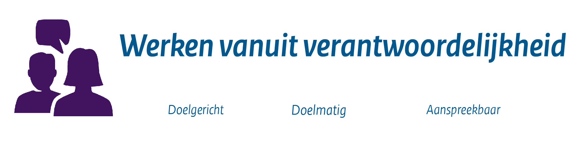 Verantwoordelijk zijn en verantwoordelijkheid nemen, betekent dat we eigenaarschap tonen in ons werk en eigen initiatief nemen. Dat we aanspreekbaar zijn op ons werk en de voortgang ervan verzekeren. Mensen moeten op ons kunnen bouwen en ergens terecht kunnen. Ook bij wisseling van personeel.